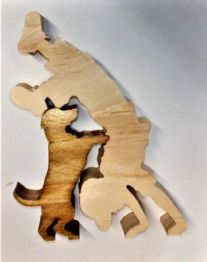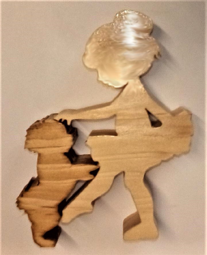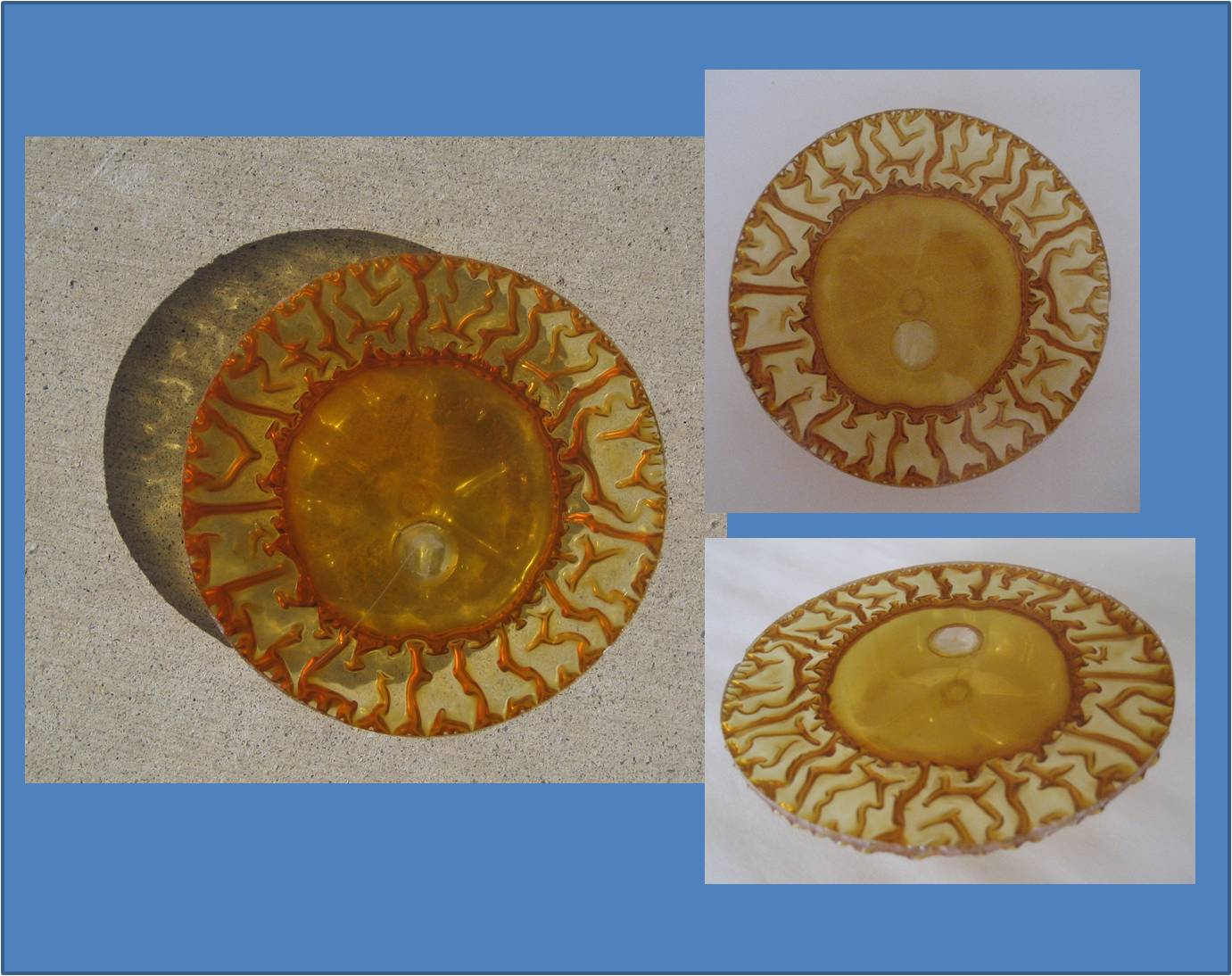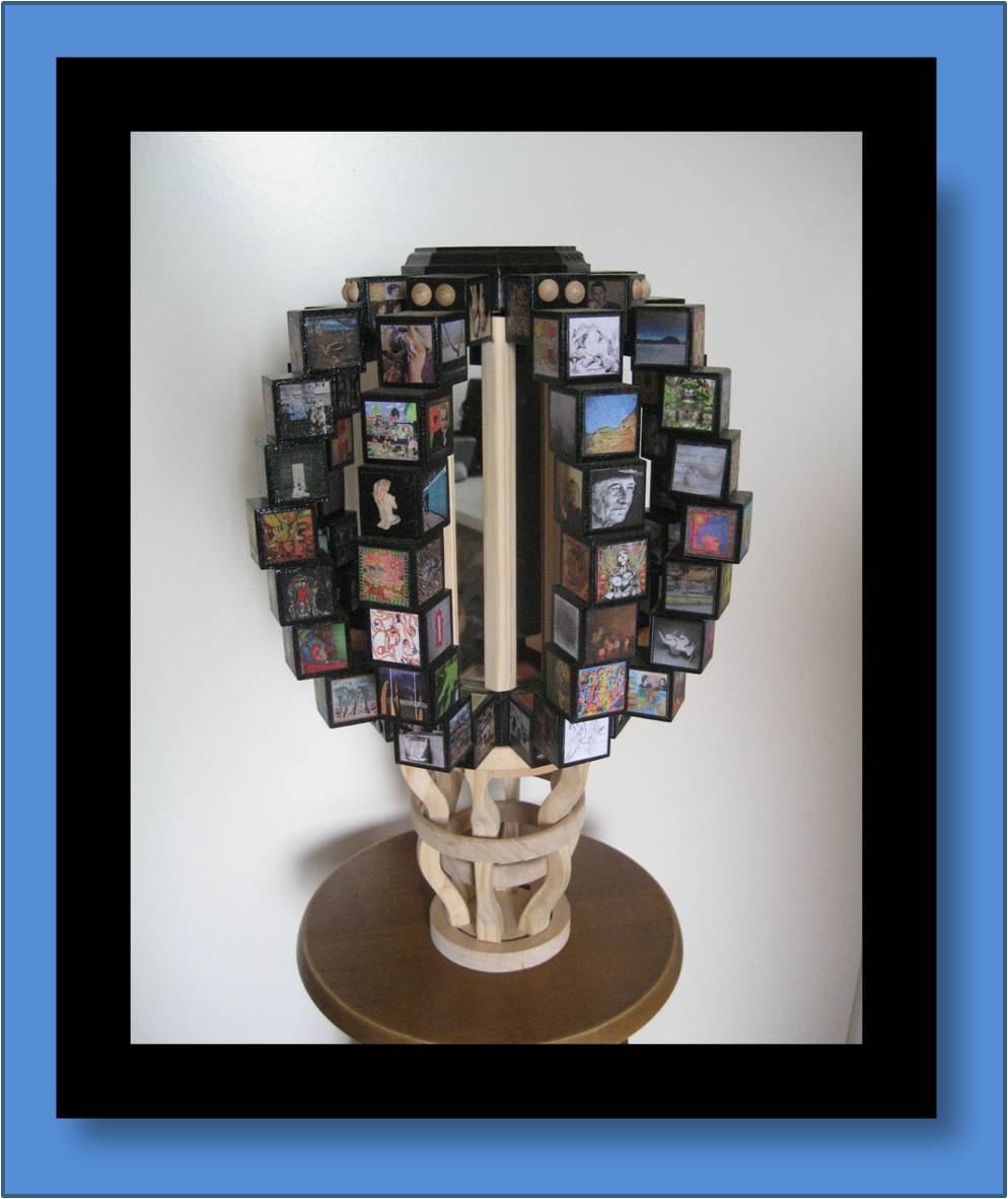 13"dia x 21"tall made of wood, paper and mirrors. The cubes that make up the eight sides of the sphere contain the artwork of over 60 artists. The base is a puzzle that completely disassembles to its individual pieces.