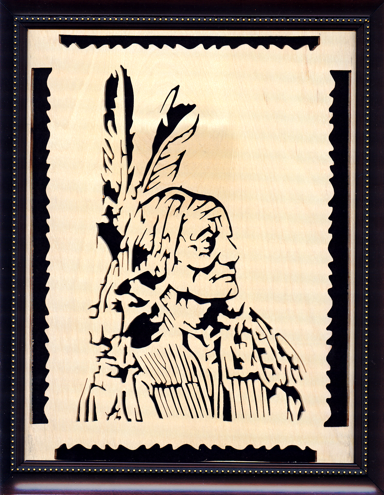 Unless otherwise specified, these scroll saw portraits are cut from 1/8" Baltic Birch plywood, backed with black felt, and secured in a standing/wall mount black 8" x 10" frame.